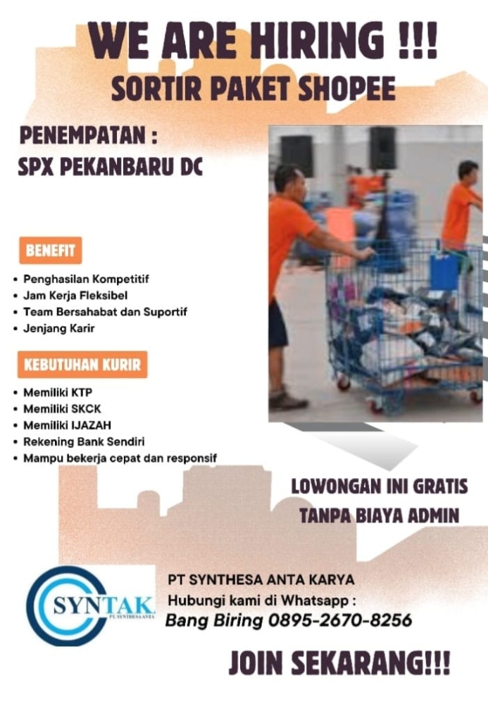 PT Synthesa Anta Karya (SYNTAKA) membuka kesempatan kerja bagi kamu yang ingin bergabung sebagai Tim Sortir Paket Shopee dengan penempatan di SPX Pekanbaru Distribution Center (DC).